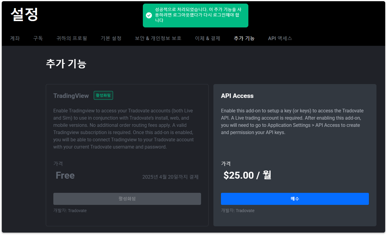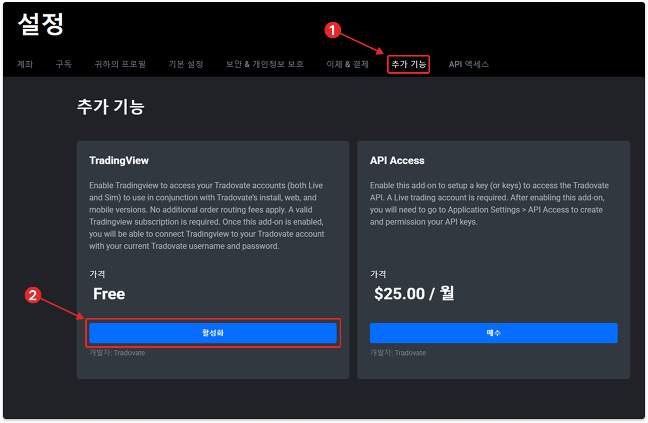 추가 기능 탭에서 TradingView 기능의 활성화 버튼을 클릭해주세요.안내 메시지와 함께 버튼이 활성화됨으로 바뀌면 성공입니다.