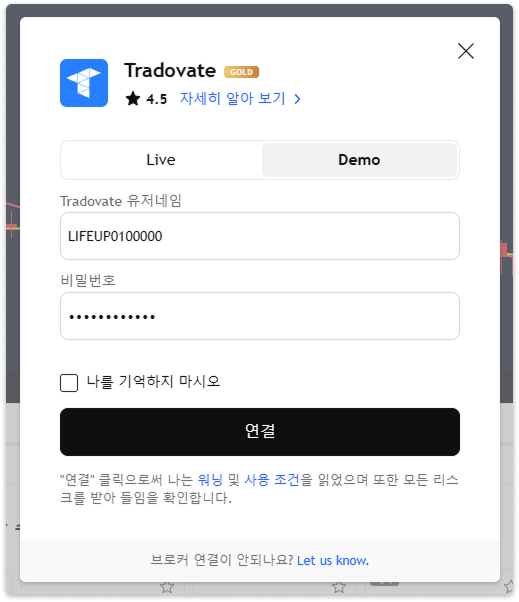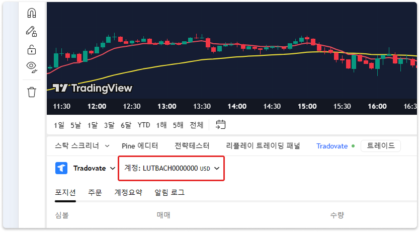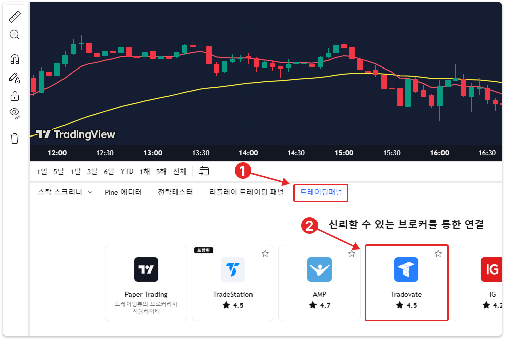 트레이딩뷰의 차트의 트레이딩패널 탭에서 Tradovate를 클릭해주세요.