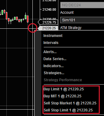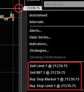 원하는 가격에 도달할 경우 포지션에 진입하도록 예약하는 기능입니다.닌자트레이더에서는 차트에서 우클릭으로 간단하게 지정할 수 있습니다.