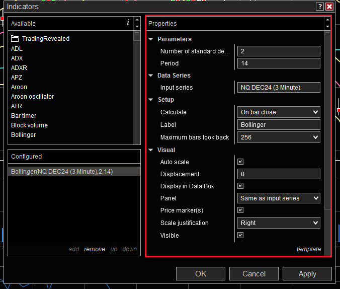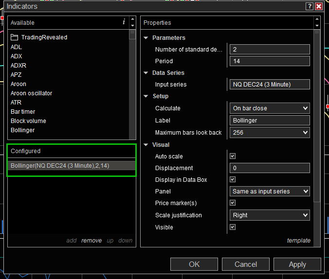 예를 들어, 볼린저 밴드 보조 지표를 추가하고 싶을 때, Available에 있는 Bollinger를 더블 클릭하면 Configured 목록에 추가되어, 차트에도 적용되는 것을 확인할 수 있습니다.