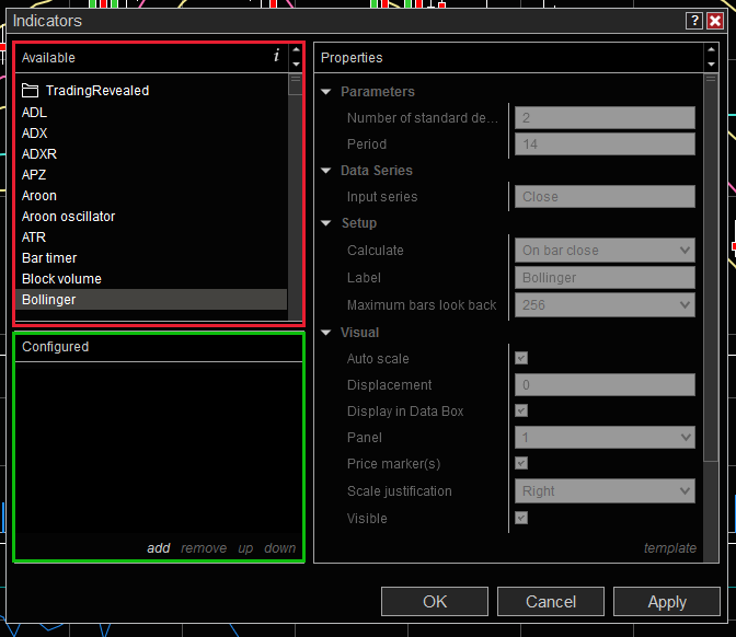 Available(빨간색 사각형)에 있는 리스트는 추가 가능한 보조지표 목록입니다.추가하고 싶은 보조 지표를 골라 더블 클릭하면 Configured(초록색 사각형)에 추가되는데, 여기는 차트에 적용된 보조지표 목록입니다.