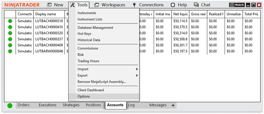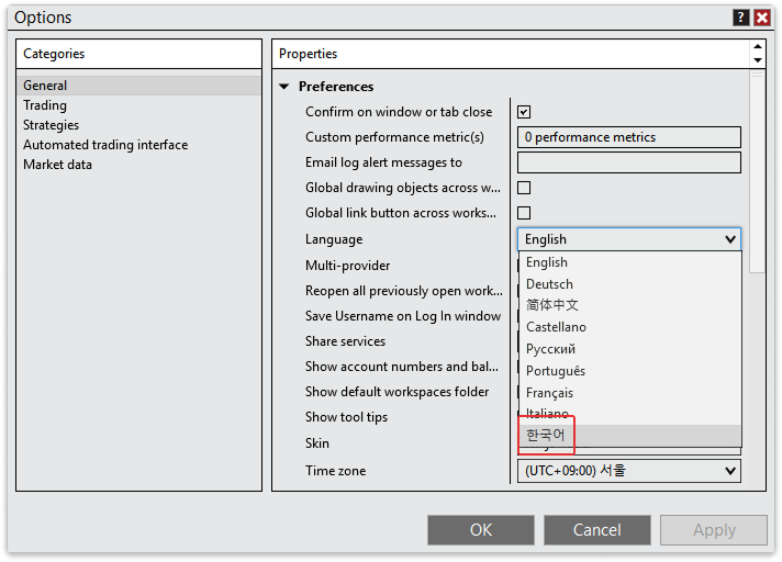 1. 닌자트레이더 제어센터 Options를 클릭해주세요.2. General의 Language에서 한국어 선택 후 OK를 클릭 후 닌자트레이더를 재실행해주세요.3. 인터페이스가 한글로 변경되었습니다.
