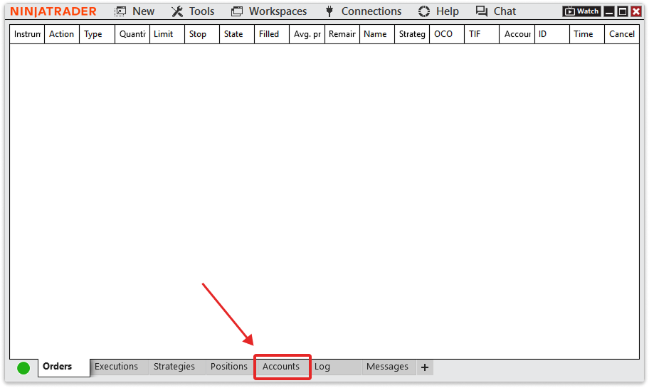 로그인 후 보이는 이 창은 닌자트레이더에서 주요 기능을 담당하는 제어 센터입니다.제어 센터 하단 Accounts 탭을 클릭해주세요.